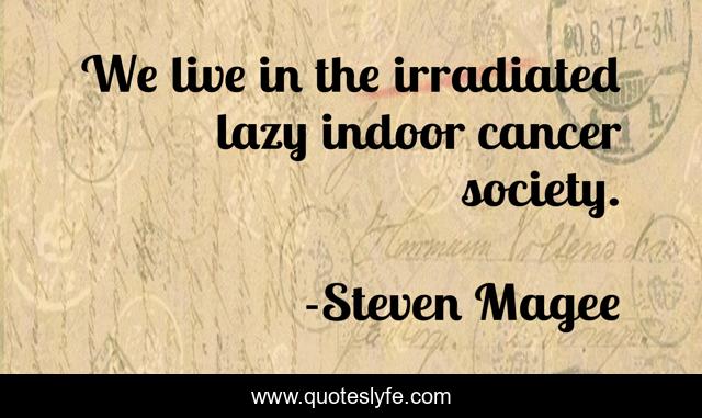 This page presents the quote "We live in the irradiated lazy indoor cancer society.". Author of this quote is Steven Magee. This quote is about lazy, cancer, irradiated, indoor, radiation, we, society, live, radiation-effects,.