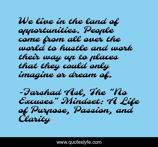 "Farshad Asl, The "No Excuses" Mindset: A Life of Purpose, Passion, and Clarity Quotes." Quoteslyfe.com, 2025. Mon. 08 Dec. 2025. <https://www.quoteslyfe.com/quote/We-live-in-the-land-of-opportunities-53667>.