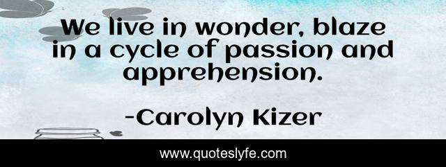 This page presents the quote "We live in wonder, blaze in a cycle of passion and apprehension.". Author of this quote is Carolyn Kizer. This quote is about life, apprehension, live, passion, blaze, apprehensiveness, life-cycle, wonder,.