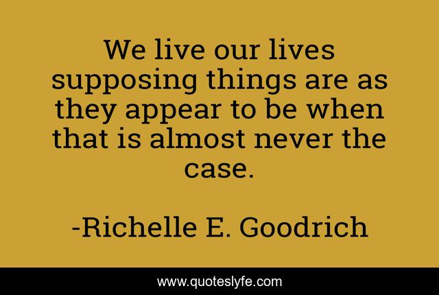 This page presents the quote "We live our lives supposing things are as they appear to be when that is almost never the case.". Author of this quote is Richelle E. Goodrich. This quote is about living, richelle-e-goodrich, appearances, judging, ignoring-issues, assumptions, richelle, appearances-are-deceiving, assuming,.