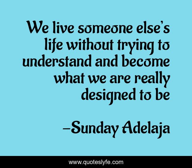 This page presents the quote "We live someone else’s life without trying to understand and become what we are really designed to be". Author of this quote is Sunday Adelaja. This quote is about life, true-identity, calling, design, purpose, truth, understanding,.