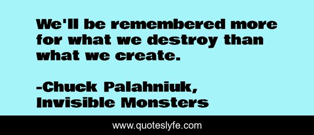 This page presents the quote "We'll be remembered more for what we destroy than what we create.". Author of this quote is Chuck Palahniuk, Invisible Monsters. .