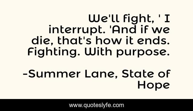 This page presents the quote "We'll fight, ' I interrupt. 'And if we die, that's how it ends. Fighting. With purpose.". Author of this quote is Summer Lane, State of Hope. This quote is about military-romance, survival, cassidy-hart,.