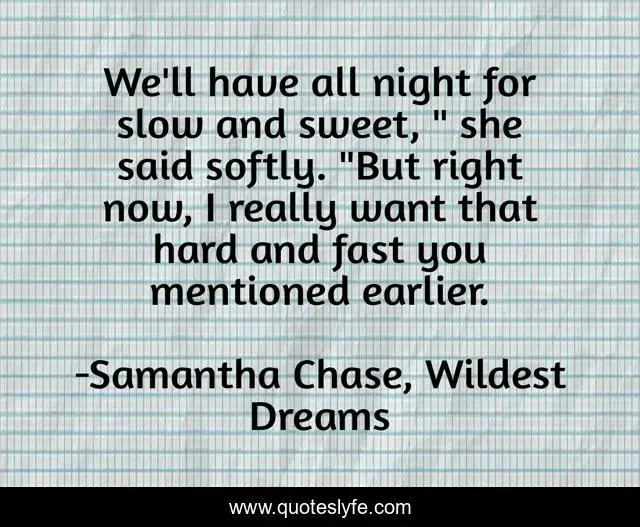 This page presents the quote "We'll have all night for slow and sweet, " she said softly. "But right now, I really want that hard and fast you mentioned earlier.". Author of this quote is Samantha Chase, Wildest Dreams. This quote is about contemporary-romance, book-store, snow, second-chances, small-town-romance, second-chance-at-love,.