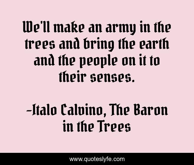 This page presents the quote "We'll make an army in the trees and bring the earth and the people on it to their senses.". Author of this quote is Italo Calvino, The Baron in the Trees. This quote is about childhood, passion-unleashed, nature,.