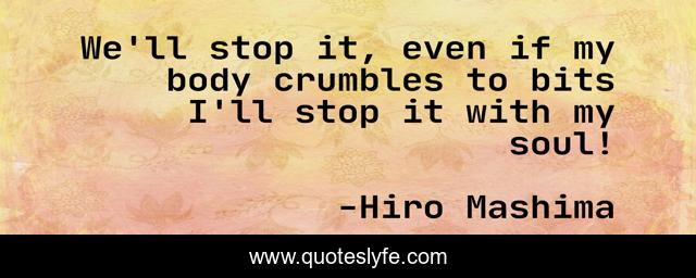 This page presents the quote "We'll stop it, even if my body crumbles to bits I'll stop it with my soul!". Author of this quote is Hiro Mashima. This quote is about fairy-tail, soul, natsu-dragneel,.