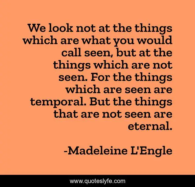 This page presents the quote "We look not at the things which are what you would call seen, but at the things which are not seen. For the things which are seen are temporal. But the things that are not seen are eternal.". Author of this quote is Madeleine L'Engle. This quote is about epistemology, philosophical, cool,.