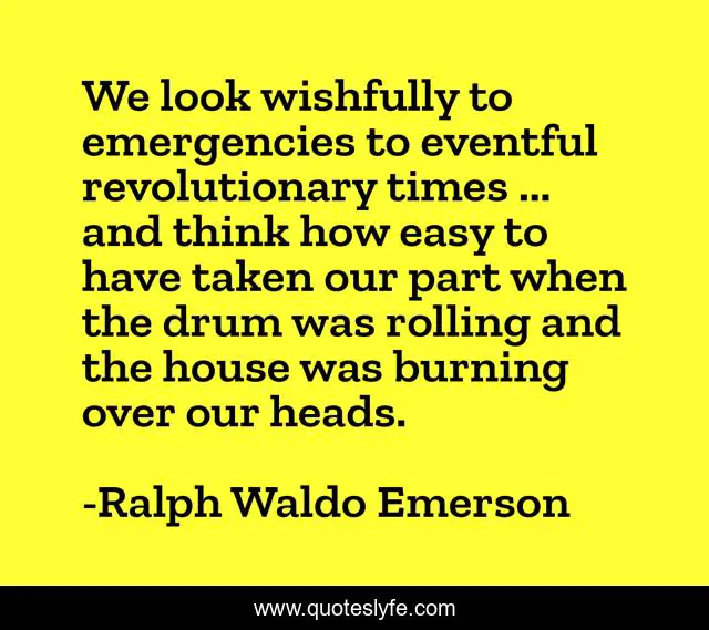 This page presents the quote "We look wishfully to emergencies to eventful revolutionary times ... and think how easy to have taken our part when the drum was rolling and the house was burning over our heads.". Author of this quote is Ralph Waldo Emerson. This quote is about boring, days,.