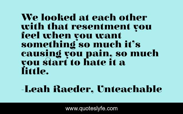 This page presents the quote "We looked at each other with that resentment you feel when you want something so much it’s causing you pain, so much you start to hate it a little.". Author of this quote is Leah Raeder, Unteachable. .
