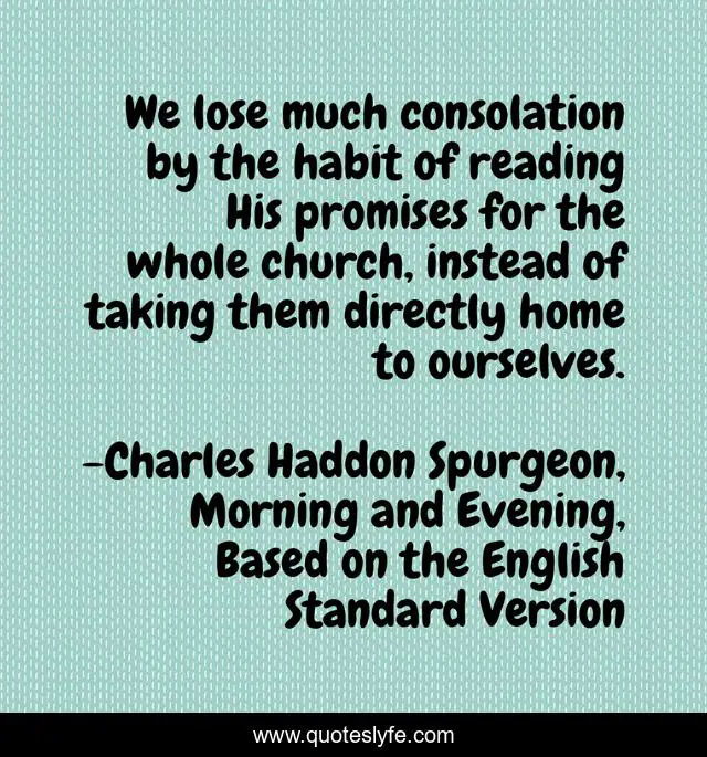 This page presents the quote "We lose much consolation by the habit of reading His promises for the whole church, instead of taking them directly home to ourselves.". Author of this quote is Charles Haddon Spurgeon, Morning and Evening, Based on the English Standard Version. This quote is about discipleship, word-of-god, emotions,.