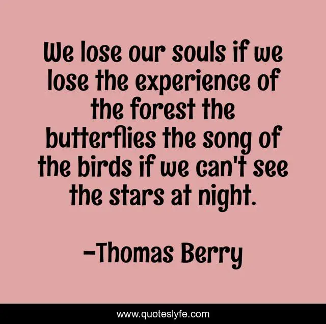 This page presents the quote "We lose our souls if we lose the experience of the forest the butterflies the song of the birds if we can't see the stars at night.". Author of this quote is Thomas Berry. .