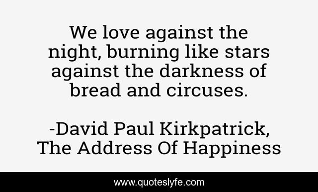 This page presents the quote "We love against the night, burning like stars against the darkness of bread and circuses.". Author of this quote is David Paul Kirkpatrick, The Address Of Happiness. This quote is about despair, love, affection, night,.