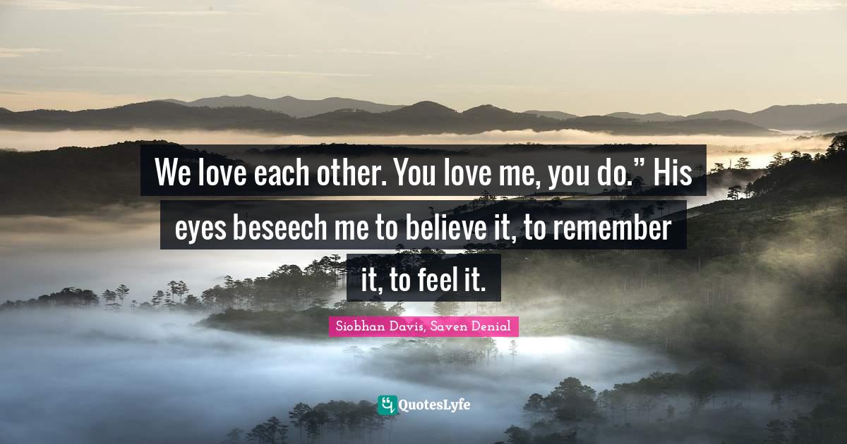 This page presents the quote "We love each other. You love me, you do.” His eyes beseech me to believe it, to remember it, to feel it.". Author of this quote is Siobhan Davis, Saven Denial. This quote is about teen-romance, teen-scifi-romance, coming-of-age, teen-love, emotional-pain,.