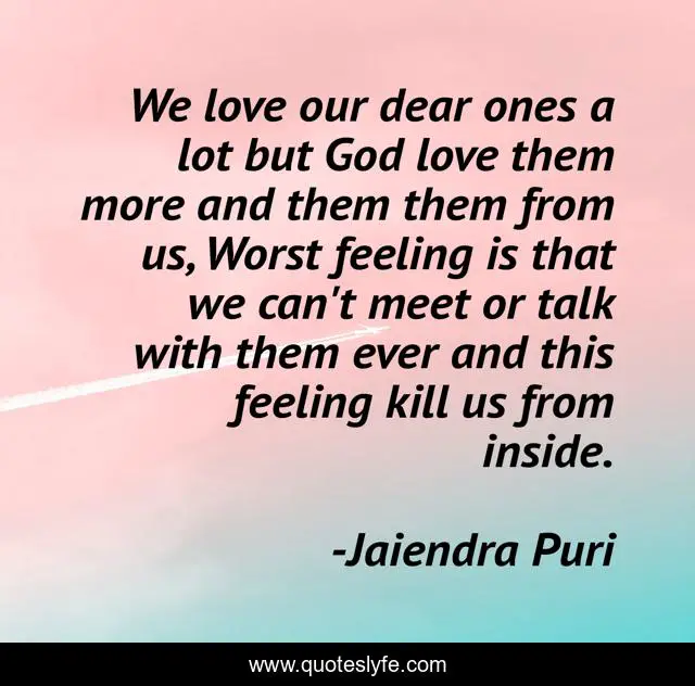 This page presents the quote "We love our dear ones a lot but God love them more and them them from us, Worst feeling is that we can't meet or talk with them ever and this feeling kill us from inside.". Author of this quote is Jaiendra Puri. .