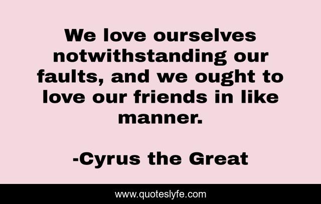 This page presents the quote "We love ourselves notwithstanding our faults, and we ought to love our friends in like manner.". Author of this quote is Cyrus the Great. This quote is about life, death, humor, frienship, philosophy, love, affection,.