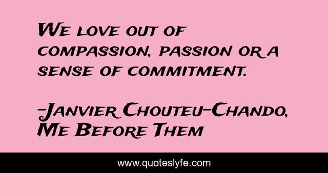 This page presents the quote "We love out of compassion, passion or a sense of commitment.". Author of this quote is Janvier Chouteu-Chando, Me Before Them. This quote is about faith, humor, dreams, family, betrayal, hope, altruism, friendship, solidarity,.