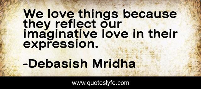 This page presents the quote "We love things because they reflect our imaginative love in their expression.". Author of this quote is Debasish Mridha. This quote is about life, love, knowledge, inspirational, intelligence, philosophy, wisdom, quotes, affection,.