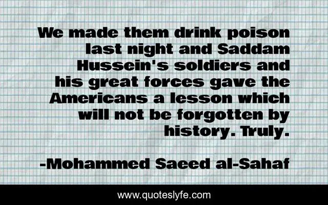 This page presents the quote "We made them drink poison last night and Saddam Hussein's soldiers and his great forces gave the Americans a lesson which will not be forgotten by history. Truly.". Author of this quote is Mohammed Saeed al-Sahaf. This quote is about great, poison, night,.
