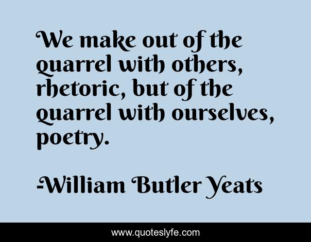 This page presents the quote "We make out of the quarrel with others, rhetoric, but of the quarrel with ourselves, poetry.". Author of this quote is William Butler Yeats. This quote is about rhetoric, others, quarrel,.