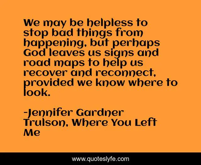 This page presents the quote "We may be helpless to stop bad things from happening, but perhaps God leaves us signs and road maps to help us recover and reconnect, provided we know where to look.". Author of this quote is Jennifer Gardner Trulson, Where You Left Me. This quote is about god, tragedy, hope,.