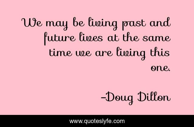 This page presents the quote "We may be living past and future lives at the same time we are living this one.". Author of this quote is Doug Dillon. This quote is about life, centeredness, mindfulness, philosophy, past, spirituality, future, time, present,.