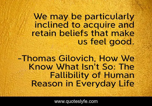 This page presents the quote "We may be particularly inclined to acquire and retain beliefs that make us feel good.". Author of this quote is Thomas Gilovich, How We Know What Isn't So: The Fallibility of Human Reason in Everyday Life. This quote is about beliefs, reasoning,.