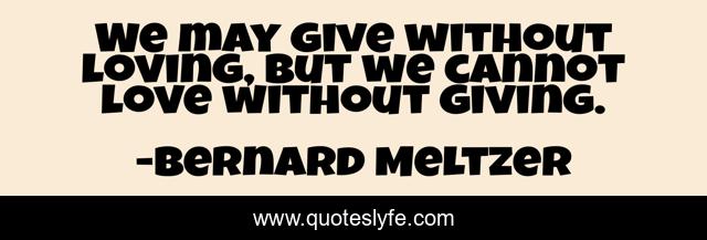 This page presents the quote "We may give without loving, but we cannot love without giving.". Author of this quote is Bernard Meltzer. This quote is about giving, may, loving,.