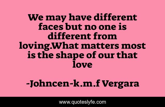 This page presents the quote "We may have different faces but no one is different from loving.What matters most is the shape of our that love". Author of this quote is Johncen-k.m.f Vergara. This quote is about love, wisdom, inspirational, enthusiasm, truth-of-life, affection,.
