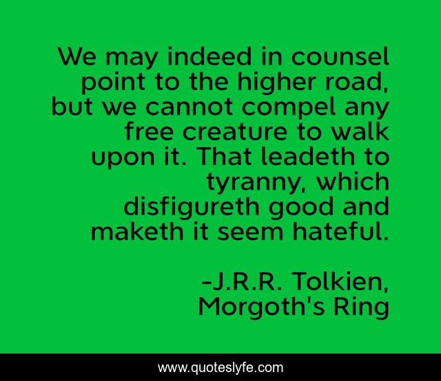 This page presents the quote "We may indeed in counsel point to the higher road, but we cannot compel any free creature to walk upon it. That leadeth to tyranny, which disfigureth good and maketh it seem hateful.". Author of this quote is J.R.R. Tolkien, Morgoth's Ring. This quote is about justice, mandos, law, tyranny,.