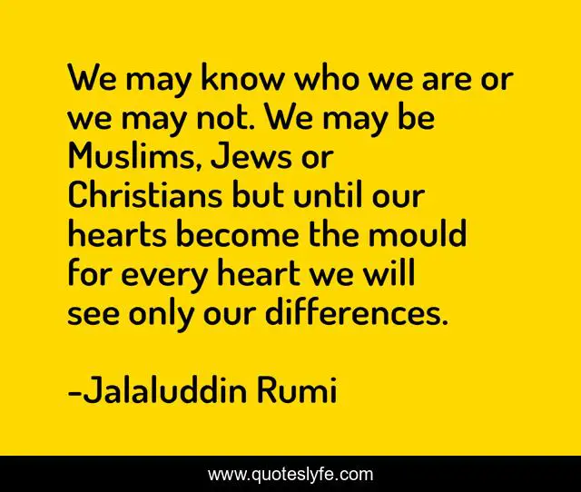 This page presents the quote "We may know who we are or we may not. We may be Muslims, Jews or Christians but until our hearts become the mould for every heart we will see only our differences.". Author of this quote is Jalaluddin Rumi. This quote is about poems, speak-to-the-heart, little-book-of-love, rumi,.