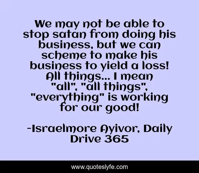 This page presents the quote "We may not be able to stop satan from doing his business, but we can scheme to make his business to yield a loss! All things... I mean "all", "all things", "everything" is working for our good!". Author of this quote is Israelmore Ayivor, Daily Drive 365. This quote is about it-is-working, enemy, food-for-thought, busy, satan-failed, business, loss, all-things, evil,.