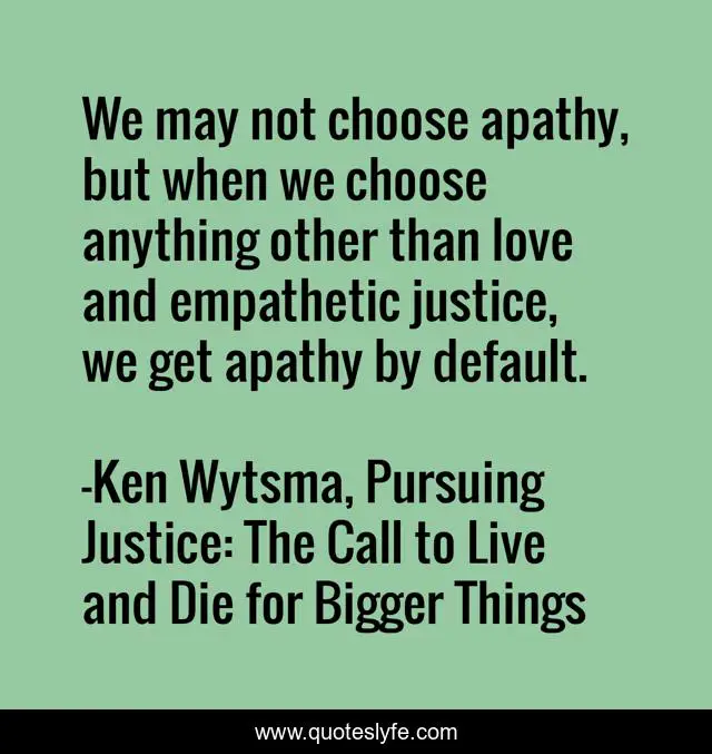 This page presents the quote "We may not choose apathy, but when we choose anything other than love and empathetic justice, we get apathy by default.". Author of this quote is Ken Wytsma, Pursuing Justice: The Call to Live and Die for Bigger Things. This quote is about justice, apathy, love, affection,.