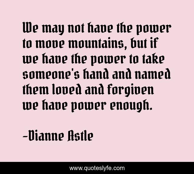 This page presents the quote "We may not have the power to move mountains, but if we have the power to take someone's hand and named them loved and forgiven we have power enough.". Author of this quote is Dianne Astle. This quote is about love, power, leadership, forgiveness, grace, affection,.