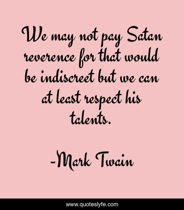 This page presents the quote "We may not pay Satan reverence for that would be indiscreet but we can at least respect his talents.". Author of this quote is Mark Twain. This quote is about hell, devil,.