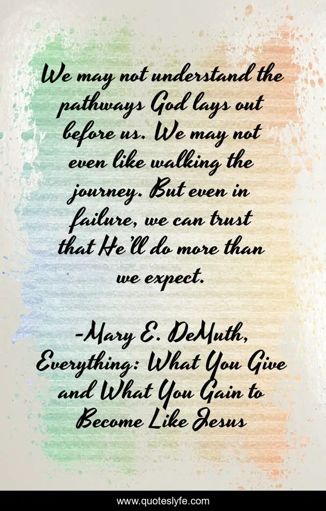 This page presents the quote "We may not understand the pathways God lays out before us. We may not even like walking the journey. But even in failure, we can trust that He’ll do more than we expect.". Author of this quote is Mary E. DeMuth, Everything: What You Give and What You Gain to Become Like Jesus. This quote is about faith, religion, god, uncertainty, expectations, failure, journey, inspirational, enthusiasm,.