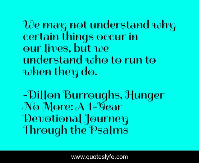 "Dillon Burroughs, Hunger No More: A 1-Year Devotional Journey Through the Psalms Quotes." Quoteslyfe.com, 2025. Fri. 05 Dec. 2025. <https://www.quoteslyfe.com/quote/We-may-not-understand-why-certain-things-143946>.