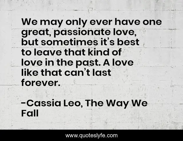 This page presents the quote "We may only ever have one great, passionate love, but sometimes it’s best to leave that kind of love in the past. A love like that can’t last forever.". Author of this quote is Cassia Leo, The Way We Fall. This quote is about love, passion, affection,.