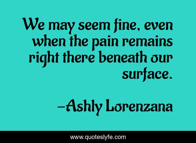 This page presents the quote "We may seem fine, even when the pain remains right there beneath our surface.". Author of this quote is Ashly Lorenzana. This quote is about coping, sadness, pain, depression, emotions,.