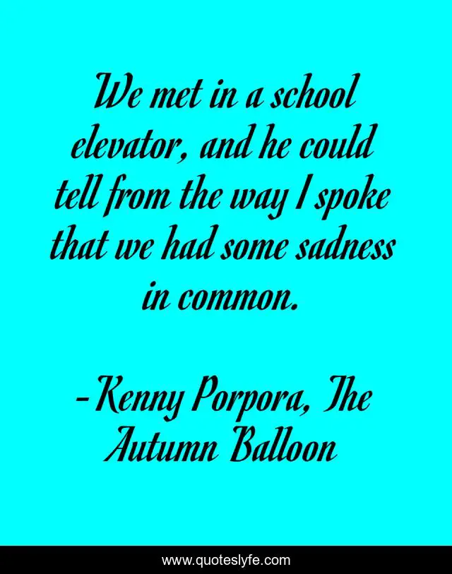 This page presents the quote "We met in a school elevator, and he could tell from the way I spoke that we had some sadness in common.". Author of this quote is Kenny Porpora, The Autumn Balloon. This quote is about sadness, comfort, depression,.