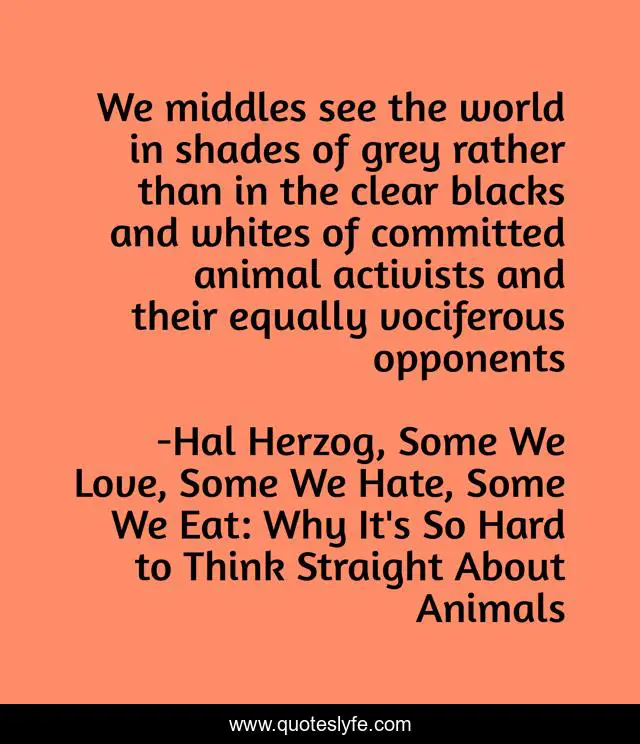 This page presents the quote "We middles see the world in shades of grey rather than in the clear blacks and whites of committed animal activists and their equally vociferous opponents". Author of this quote is Hal Herzog, Some We Love, Some We Hate, Some We Eat: Why It's So Hard to Think Straight About Animals. This quote is about animals-rights, morals, philosophy,.