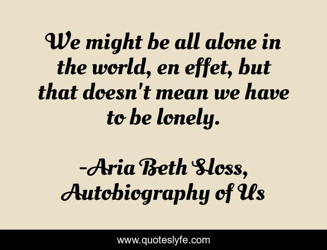This page presents the quote "We might be all alone in the world, en effet, but that doesn't mean we have to be lonely.". Author of this quote is Aria Beth Sloss, Autobiography of Us. This quote is about alone, life, alone-but-not-lonely,.