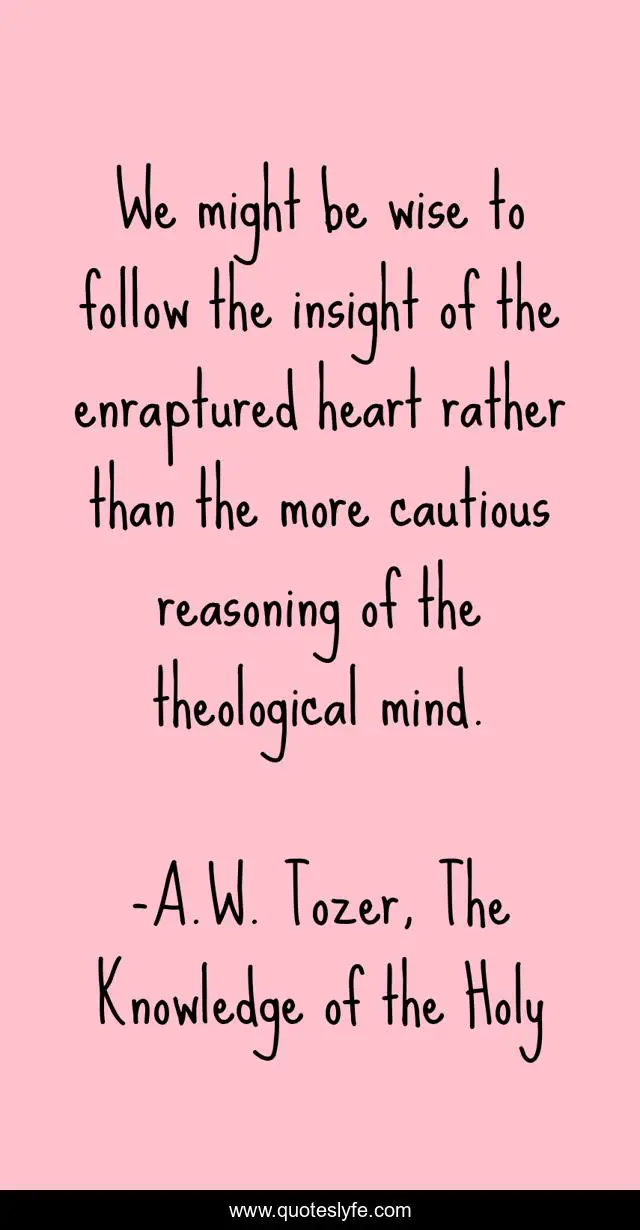 This page presents the quote "We might be wise to follow the insight of the enraptured heart rather than the more cautious reasoning of the theological mind.". Author of this quote is A.W. Tozer, The Knowledge of the Holy. This quote is about jesus-christ, holy, god, christianity, christian-life, jesus, worship,.