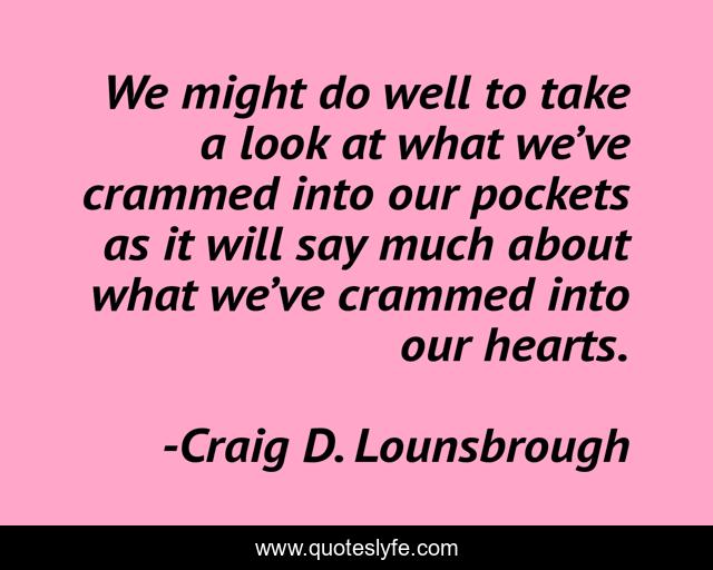 This page presents the quote "We might do well to take a look at what we’ve crammed into our pockets as it will say much about what we’ve crammed into our hearts.". Author of this quote is Craig D. Lounsbrough. This quote is about self-study, introspection, self-awareness, importance, self-evaluation, focus, priorities, introspective, observe,.