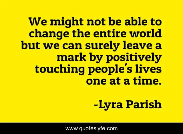 This page presents the quote "We might not be able to change the entire world but we can surely leave a mark by positively touching people's lives one at a time.". Author of this quote is Lyra Parish. This quote is about life, inspirational, positivity, life-lessons, enthusiasm, change,.