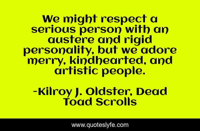 This page presents the quote "We might respect a serious person with an austere and rigid personality, but we adore merry, kindhearted, and artistic people.". Author of this quote is Kilroy J. Oldster, Dead Toad Scrolls. This quote is about kindhearted, kindheartedness, admirer, adore, artists, respect, friendship, personality,.