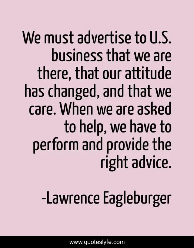 This page presents the quote "We must advertise to U.S. business that we are there, that our attitude has changed, and that we care. When we are asked to help, we have to perform and provide the right advice.". Author of this quote is Lawrence Eagleburger. This quote is about advice, help, business,.