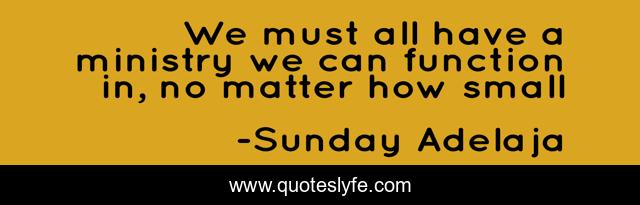 This page presents the quote "We must all have a ministry we can function in, no matter how small". Author of this quote is Sunday Adelaja. This quote is about function, goal, fulfillment, purpose, ministry,.