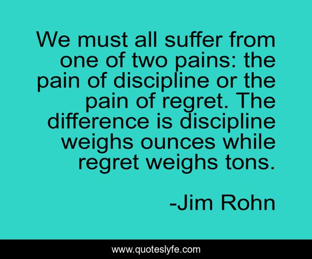 This page presents the quote "We must all suffer from one of two pains: the pain of discipline or the pain of regret. The difference is discipline weighs ounces while regret weighs tons.". Author of this quote is Jim Rohn. .