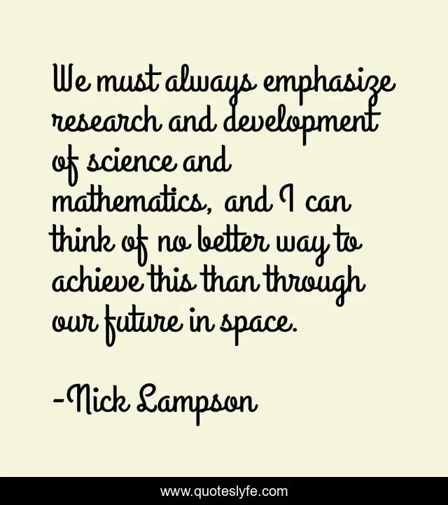 This page presents the quote "We must always emphasize research and development of science and mathematics, and I can think of no better way to achieve this than through our future in space.". Author of this quote is Nick Lampson. This quote is about science, future, mathematics,.