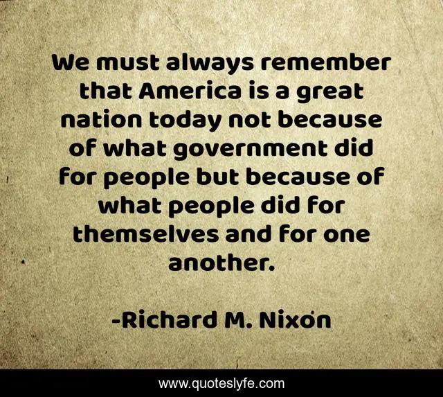 This page presents the quote "We must always remember that America is a great nation today not because of what government did for people but because of what people did for themselves and for one another.". Author of this quote is Richard M. Nixon. This quote is about america, today, government,.